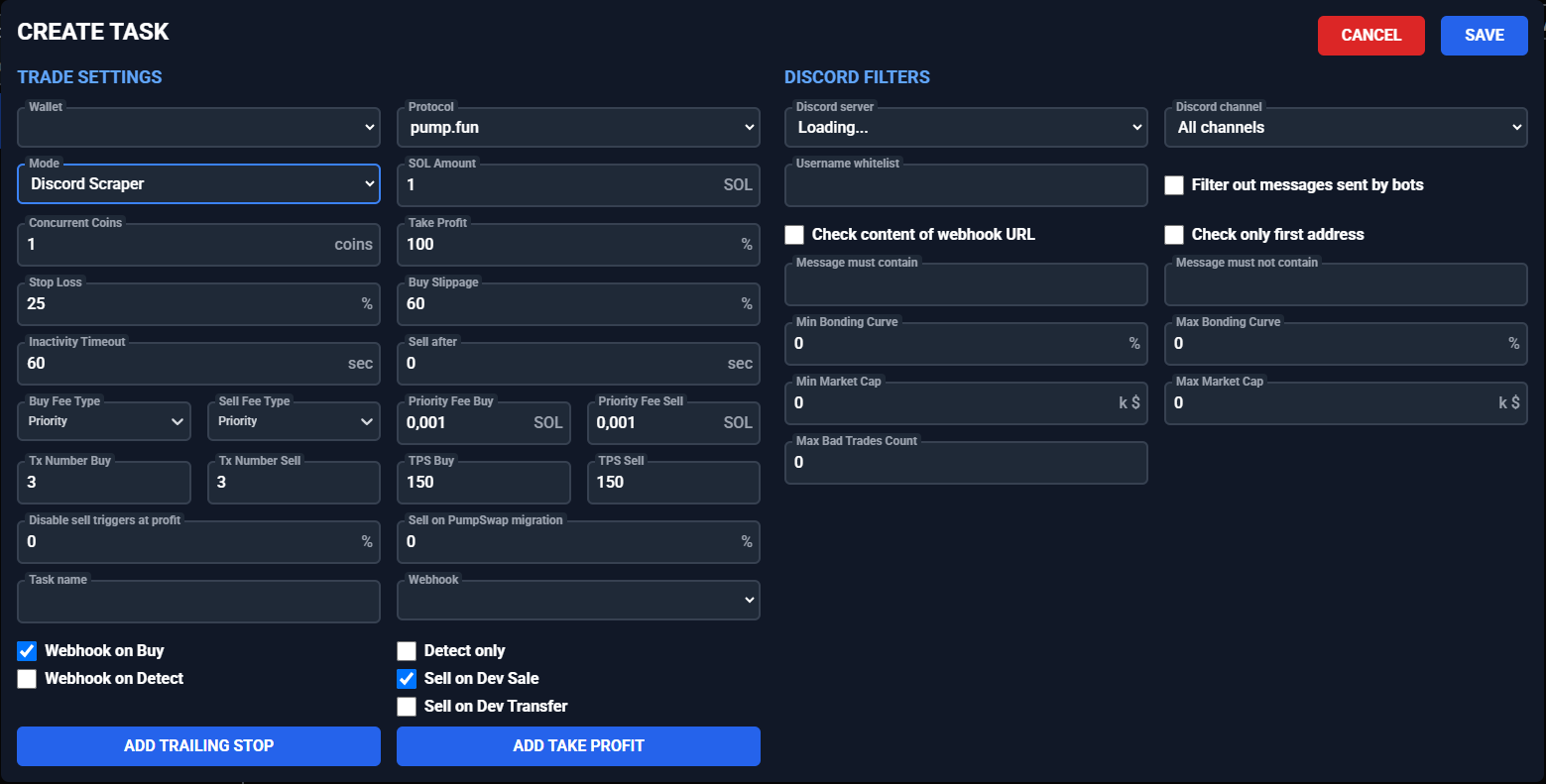 * **Webhook on buy:** If you enable this feature the bot will send a webhook once a coin gets bought with all the infos.